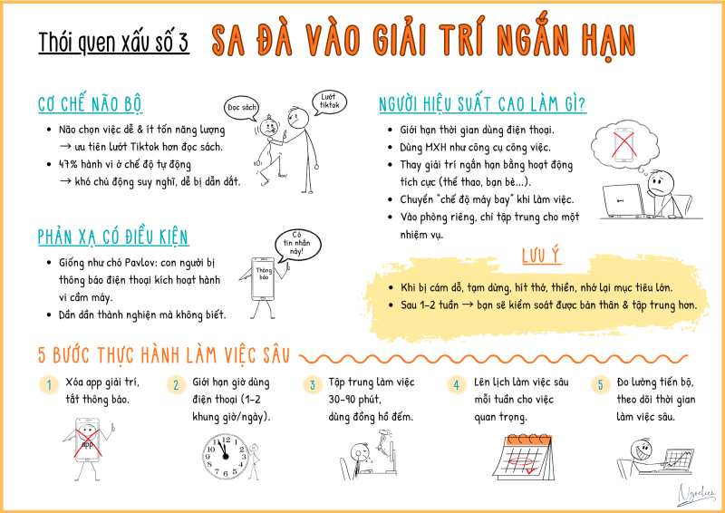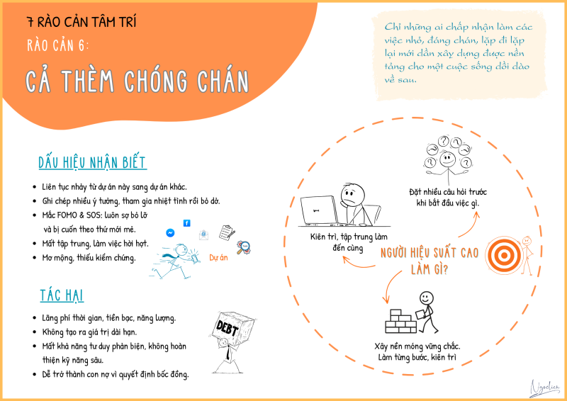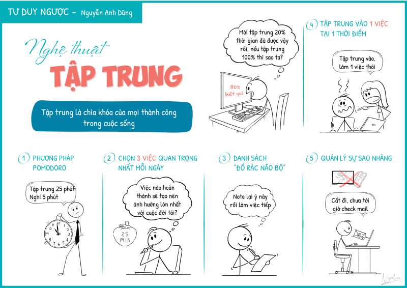 Mình hay bị tình trạng đang làm việc này, nghĩ ra một ý nào đó lại chuyển luôn sang ý tưởng mới mà quên mất việc mình đang làm, giờ mỗi lần có ý tưởng mới mình sẽ note lại, rồi tiếp tục làm chứ không làm lan man nữa.