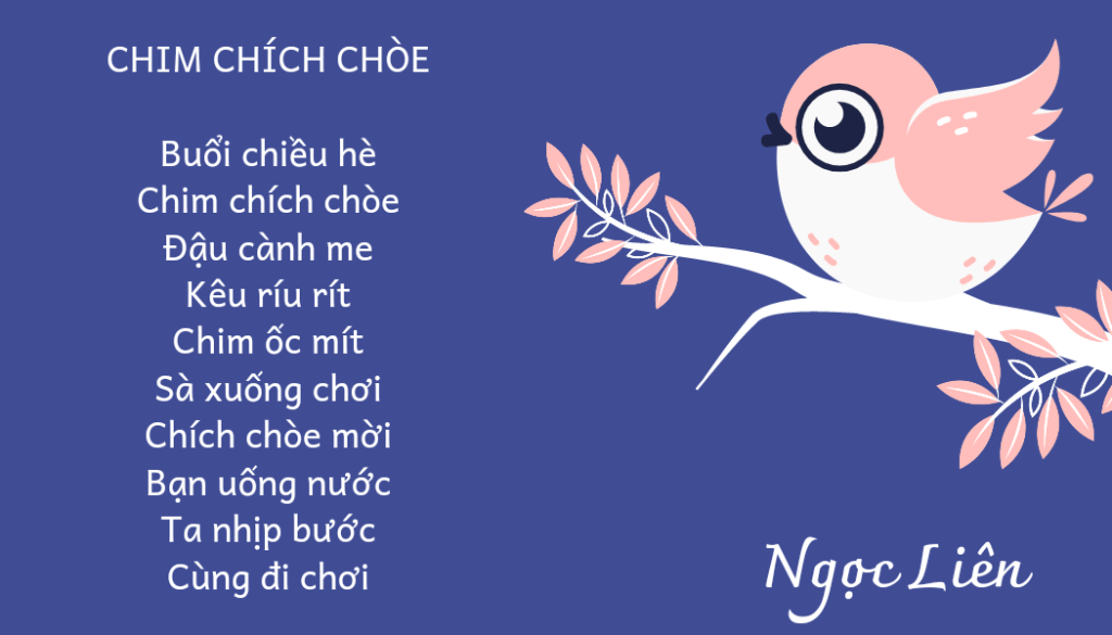 Buổi chiều hèChim chích chòeĐậu cành meKêu ríu rítChim ốc mítSà xuống chơiChích chòe mờiBạn uống nướcTa nhịp bướcCùng đi chơi