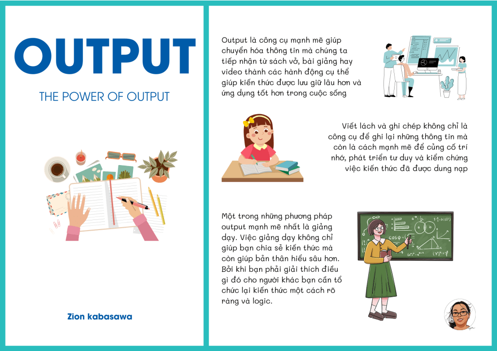 “Output là công cụ mạnh mẽ giúp biến đổi những thông tin mà chúng ta tiếp nhận từ sách vở, bài giảng hay video thành những hành động cụ thể. Thông qua đó, kiến thức không chỉ được lưu giữ lâu hơn mà còn được ứng dụng một cách hiệu quả vào cuộc sống”. Trước đây, khi chỉ đọc sách mà không ghi lại, mình nhận ra phần lớn những gì đọc được sẽ trôi tuột đi. Khi bắt đầu ghi chép, tuy không nhớ được hết, nhưng mình vẫn nắm bắt được một phần. Và kỳ diệu hơn, những kiến thức được đưa vào thực tế thì lại trở thành một phần của chính mình, nhớ rất lâu và rất sâu.
